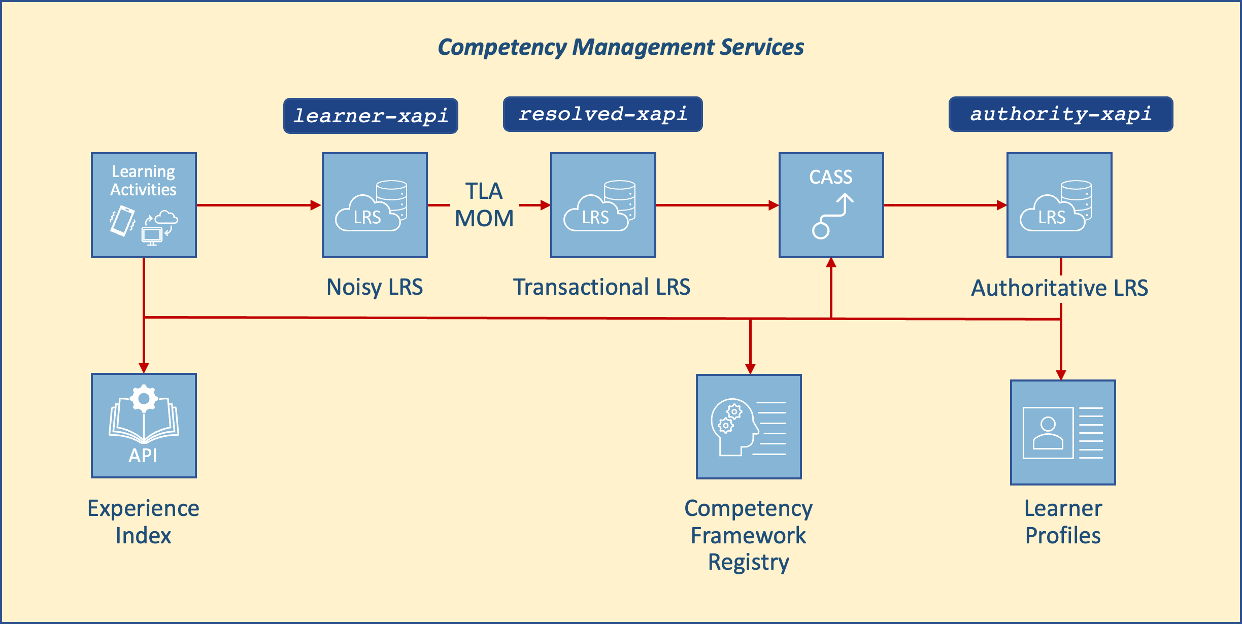 A CMS manages evidence of an individual’s knowledge, skills, abilities, attributes, experiences, personality traits, and motivators to predict their value toward effective performance. Competencies might include technical skills, business skills, leadership skills, people skills, ethics, professionalism, or any number of topics related to a job. Within the TLA Reference Implementation, the TLA MOM statements stored in the Transactional LRS provide the evidence upon which competency assertions are made.