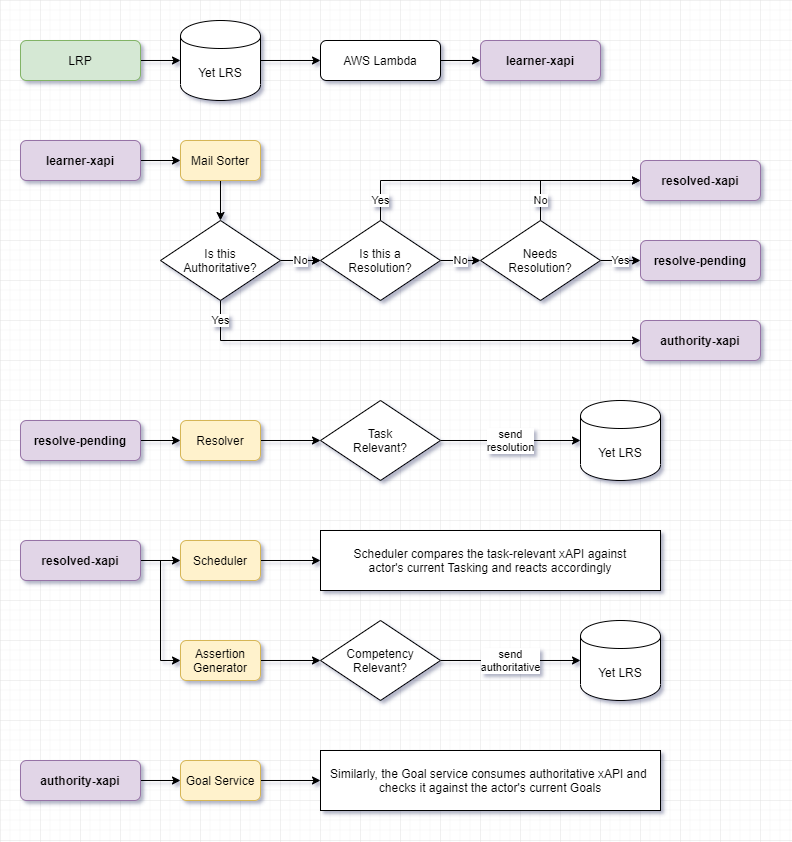 resolved-xapiand writes toauthority-xapi. It interprets the completion-relevant statements and generates competency assertions based on that activity's definition in the Experience Index. There is no logic incorporated into this service and it is not included in thedocker-compose.ymlfile because this function is handled in the TLA sanbox by CaSS.Goal Service - This services reads from both