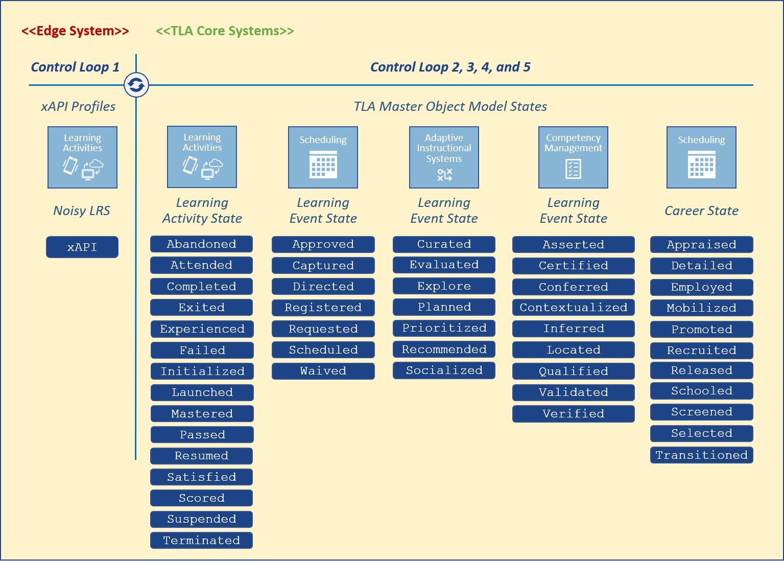 As shown in Figure 5, learning activities store raw learner data inside an LRS. Raw learner data in the form of xAPI statements are governed by xAPI Profiles and can include extremely detailed information about learner interactions inside the activity. These data support Control Loop 1. The TLA MOM normalizes the xAPI statements coming out of a learning activity, as well as other learning systems such as schedulers, competency management systems, and career field planning tools. The TLA MOM is divided into different states that describe the different interactions a learner will perform.