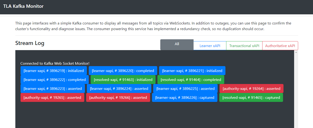 The Kafka statement viewer shown in Figure 6 is a NodeJS Express (opens new window) application that allows users to specify the Kafka brokers to use and the topics they want to monitor. Out of the box, this viewer allows users to monitor and filter xAPI data traffic across all Kafka topics. In this case, each topic is also color coded so they can visually see the Noisy LRS data, the Transactional LRS data, and the Authoritative LRS data as it is being sent to each LRS. Each statement can be expanded to review the specific contents of each xAPI statement. The Kafka statement viewer GitHub (opens new window) site provides additional information on how this might be used.