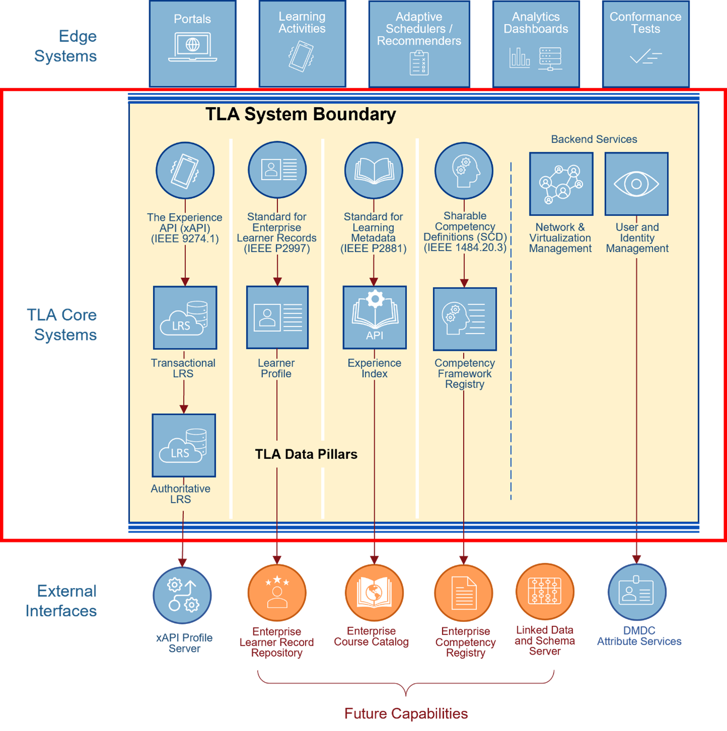 Throughout a career, learning may unfold in a variety of ways from self-regulated learning to formal programs of instruction. The TLA Reference Implementation is implemented as a network of hardware and software resources, data structures and other services that are typically maintained within a logical cybersecurity boundary. These boundaries can be organizational (e.g., school, command, business area) or specific to the myriad of different platforms used to deliver training and education experiences in the commercial marketplace (e.g., LMS, LXP, Simulation System). The TLA Reference Implementation provides a blueprint for migrating existing Learning and Development tools to the future DoD learning environment.