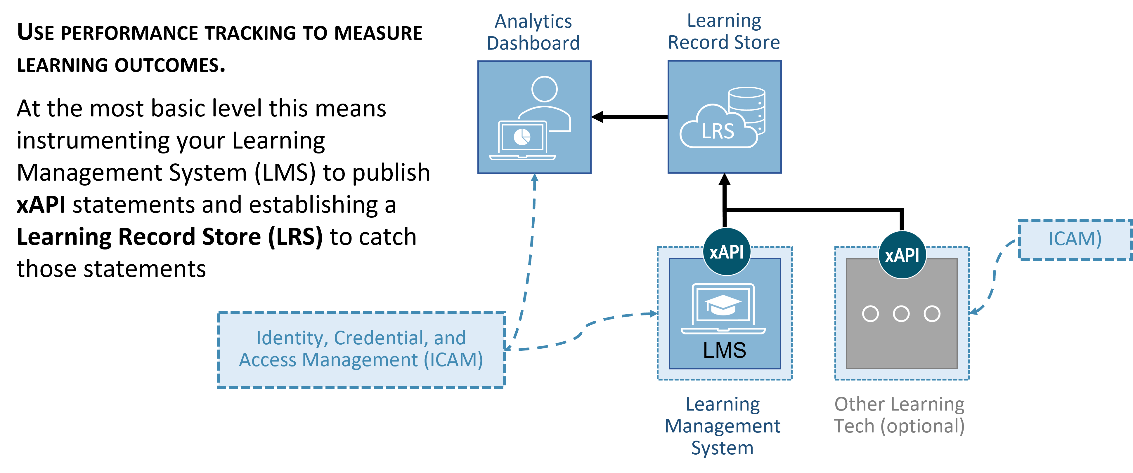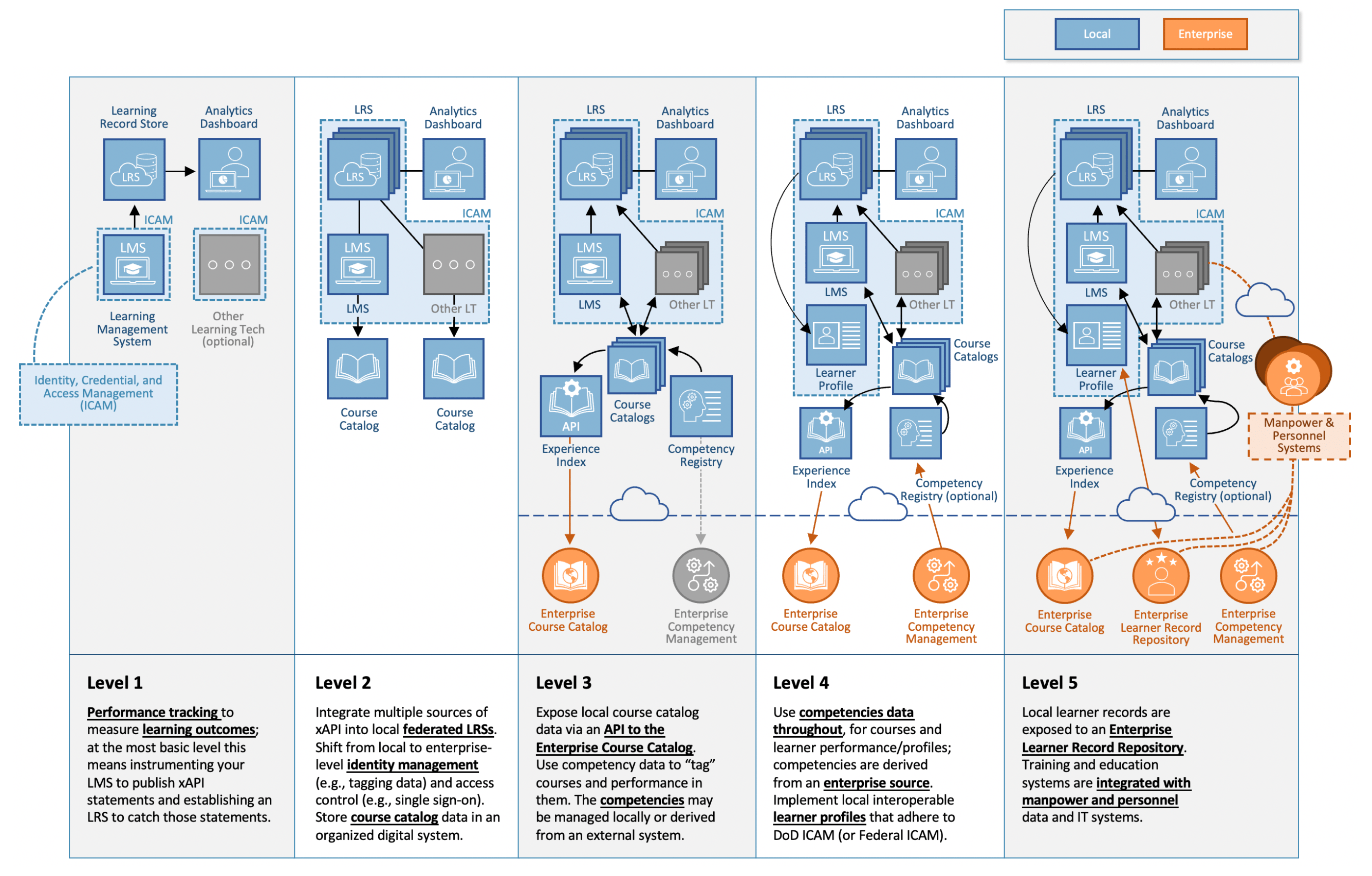 Figure 2. CMM Level 1: Organizations migrating towards TLA interoperability start at Level 1 by using learning activities that have been instrumented with the xAPI 2.0 standard. This level of maturity requires an organization to begin moving away from SCORM®-managed learning environments in favor of solutions where learner performance is stored within a centralized Learner Record Store (opens new window) (LRS). The LRS enables analytics that go beyond the statistics typically available within an LMS. ICAM is managed locally by connected systems and there is minimal ability to track learners across the different systems they interact with. Other learning activities may connect to the LRS