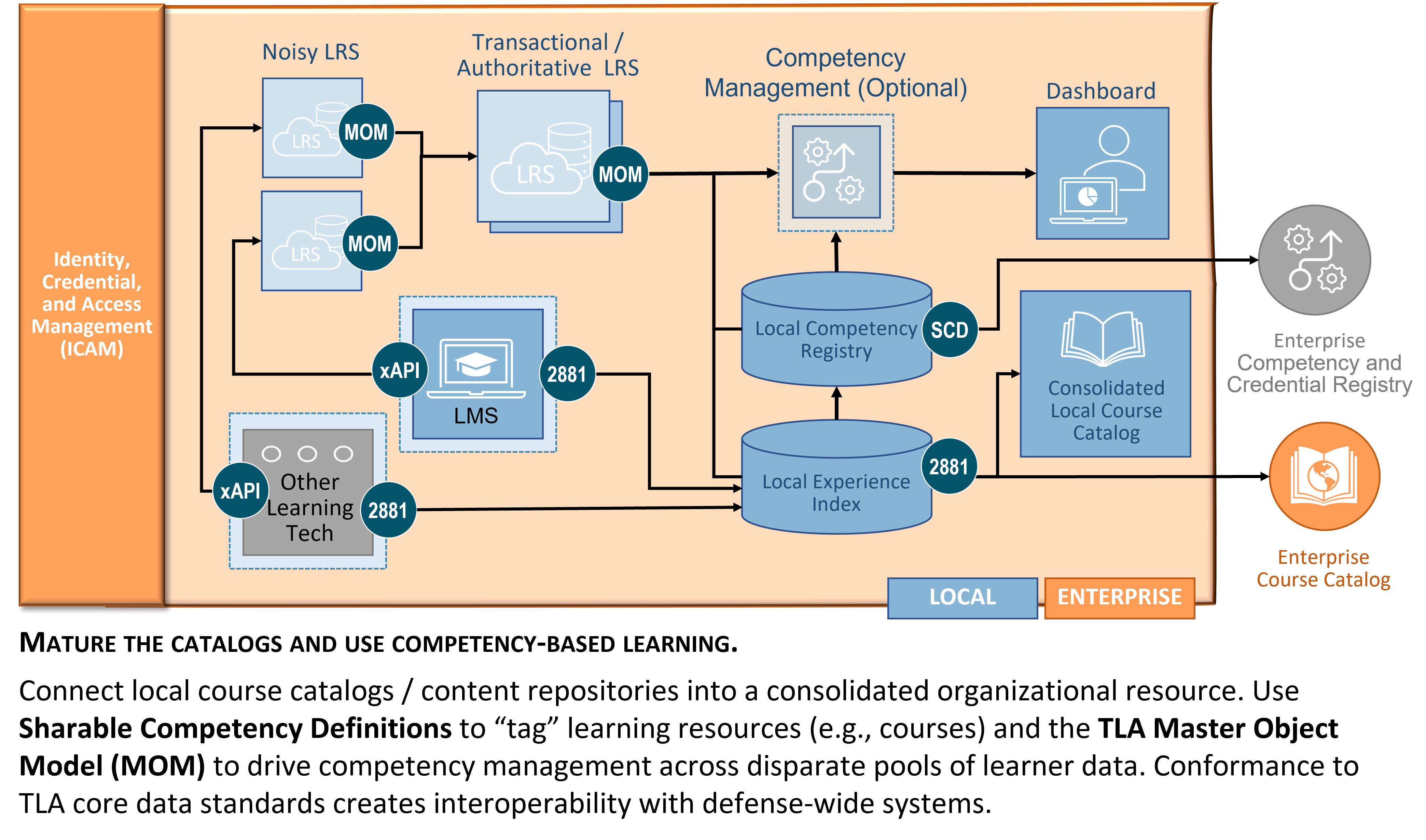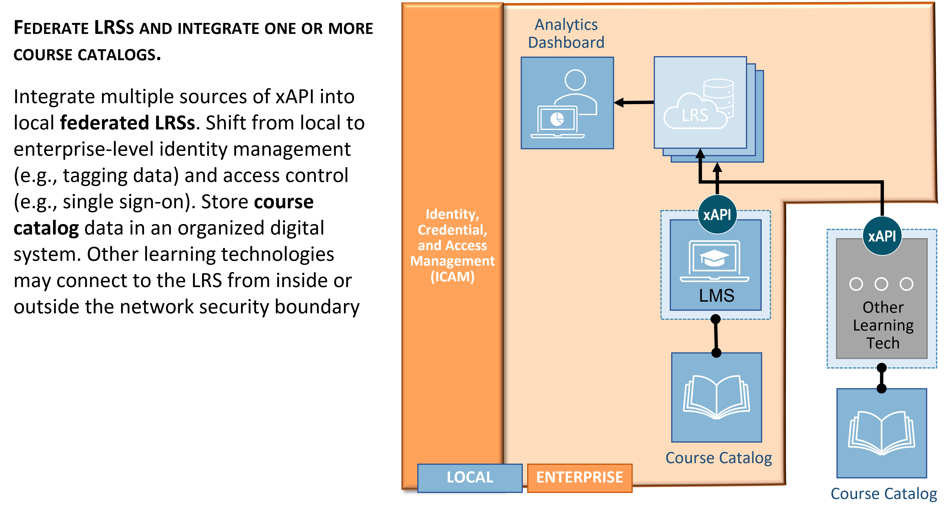 Figure 3. CMM Level 2: Federated Learner Record stores (LRSs) support the aggregation and analysis of learning data at the enterprise level. It may include numerous, interconnected LRS solutions that support the myriad of learning activities and platforms available in an organization. This requires enterprise level services and the adoption of governance procedures to standardize learner identity, data labeling, and data reporting to enable enterprise analytics. Level 2 introduces an enterprise approach to ICAM, which enables performance tracking for learners across numerous disparate systems. This level of maturity also introduces the concept of a course catalog for describing courses, activities, and other learning resources within the organization. Learner performance is tied to catalog descriptions using the TLA Master Object Model (MOM) (opens new window) and each activity's catalog identifier. A single organization may have multiple different course catalogs that are used (e.g., to support different types of learning). For example, an organization may have a course catalog that resides inside its LMS, a website with a listing of serious games, or a simulator system that includes a scenario library. Each catalog system at this level is disconnected from the other catalogs.