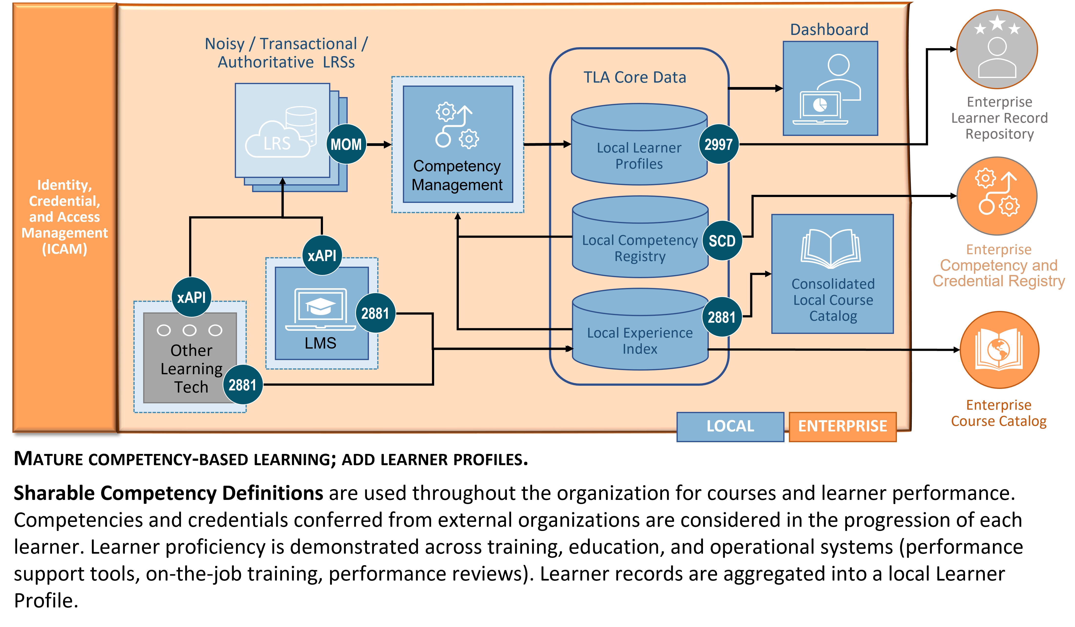 Figure 5. CMM Level 4: Competency-based learning is policy-driven and ubiquitous across the organization. A centralized learner profile aggregates individual learner records from all connected learning resources using the TLA MOM and the federated LRS structure. This approach preserves raw learner data at the local level (i.e., the evidentiary chain) while rolling up extrapolated learner data into the Transactional LRS. Learner performance is aligned to workplace (e.g., operational) competencies via a Competency Management System using the IEEE 1484.20.3 Standard for Sharable Competency Definitions. CMM Level 4 is characterized by the enterprise strategy for managing competencies that enables global competencies to be tailored to meet local contexts. Organizational credentials are aligned to the competencies they represent, and these are linked to the learner profile. Authoring and alignment between local definitions is required to ensure local tasks, conditions, and standards are encapsulated in the definitions of local competencies.