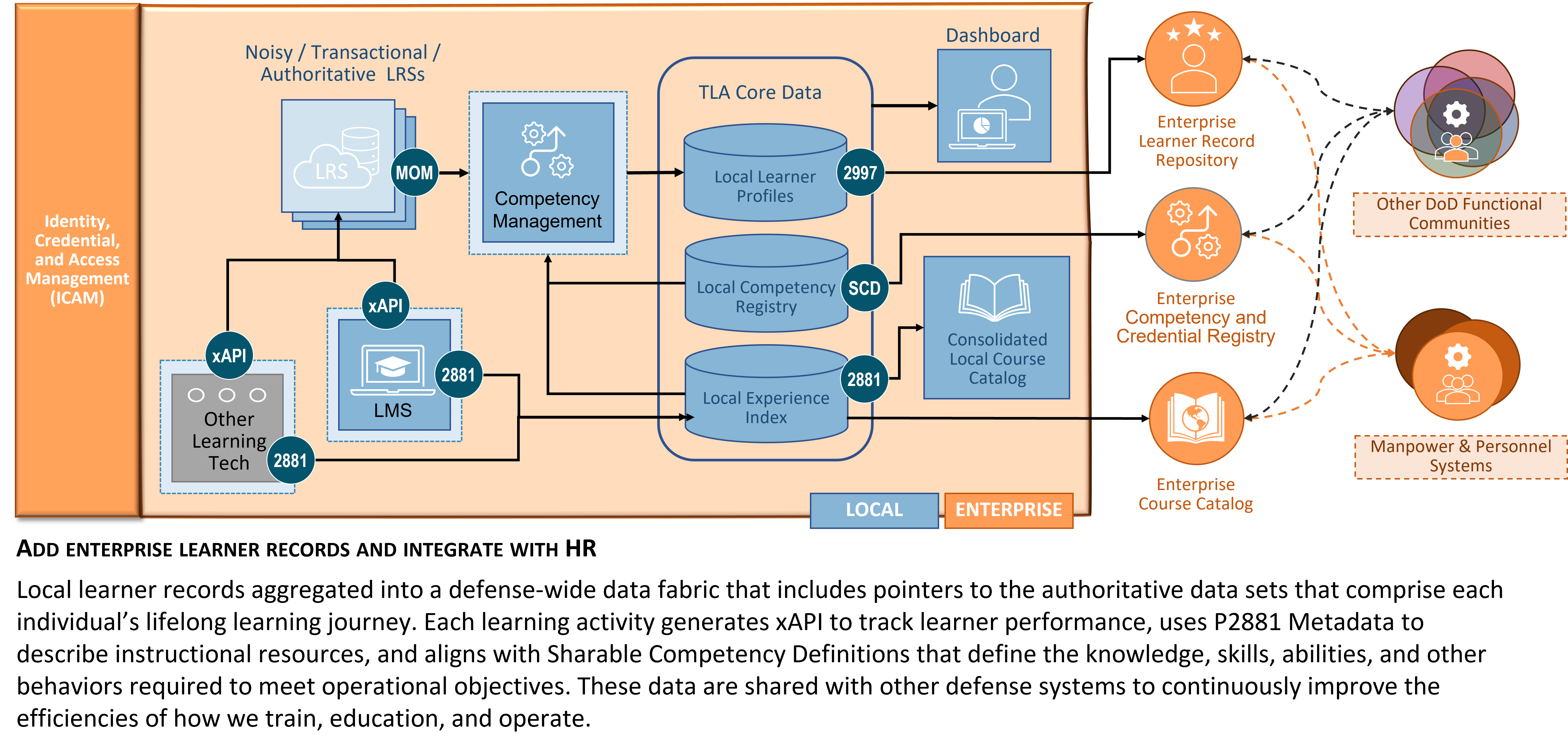 Figure 6. CMM Level 5: Learner data is used as a strategic resource throughout the organization. Learning and Development are integrated into all aspects of Human Capital Management. Employee growth is tracked, managed, and nurtured to meet the evolving needs of the organization. Enterprise learner records are tied to Human Resource, Talent Management, or other Manpower & Personnel systems to drive career management, workforce planning, and mission readiness. Competency management is tied to operational performance goals and key performance indicators in the workplace. Interconnected systems and interoperable data enable adaptive instructional systems and automation to improve the efficiency of how people learn. These levels represent the objective state of policy, technical specifications, and standards that will enable the future learning environment. The standards that comprise the TLA technical specification act as a “distributed ledger” for learner data that is globally discoverable and usable across the DoD enterprise.