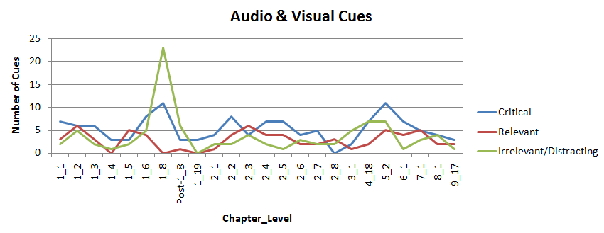 This information about the fluctuation of different types of audio and visual cues throughout the game can inform us as to how much information processing and information filtering the player has to do in order to parse the irrelevant cues from the critical and helpful cues. We'll also be able to glean the needed information from the right cues. An example of the audio and visual cue analysis is captured in the chart above.