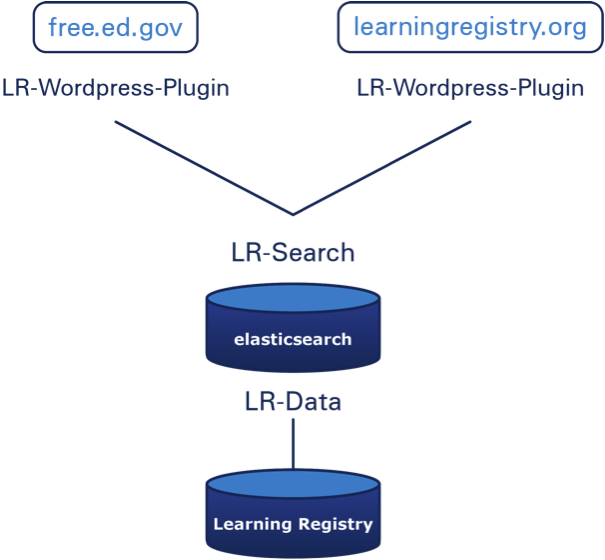 The diagram shows how two different WordPress-based websites use a WordPress plugin called LR-Wordpress-Plugin. The plugin provides several widgets that use the LR-Search services. LR-Search provides a set of services on top of elasticsearch, which is an open source search and analytics engine. LR-Data, which is a utility to pull the data from the Learning Registry into a datastore of your choice, populates elasticsearch with LR data.