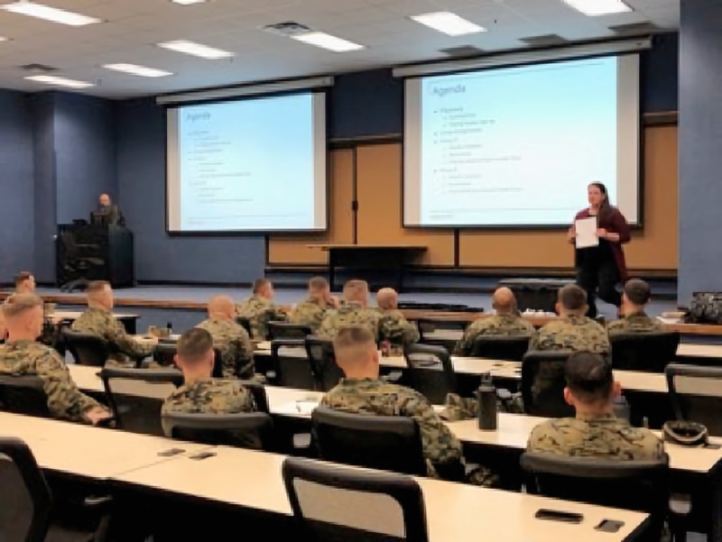 An administrator explains the schedule for the weeklong PeBL trial to Marines at Fort Sill.