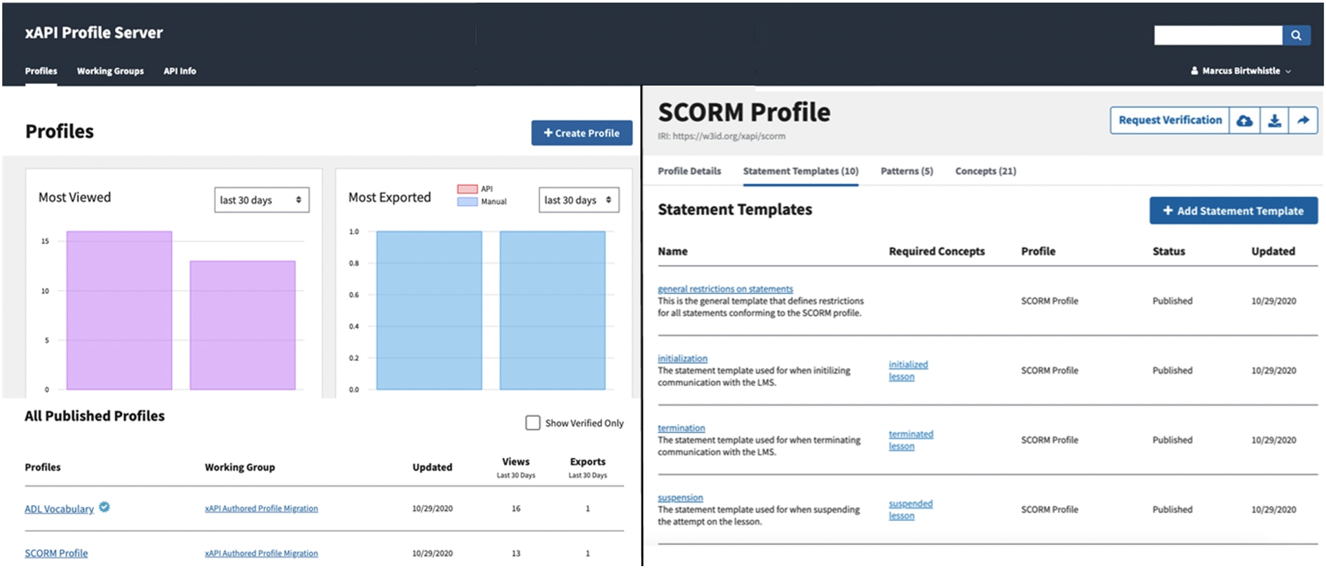 The ADL Initiative has completed an alpha version of its new xAPI Profile Server and plans to release a forthcoming beta version for user testing in the second quarter of 2021. This web-based application will support the authoring, management, and publishing of xAPI Profiles. It also features user-friendly tools to make it easier for instructional developers and designers to employ xAPI Profiles, to include using standardized verbs, templates, patterns, and concepts, while ensuring conformance to the xAPI Profile specification and DoD data strategies.