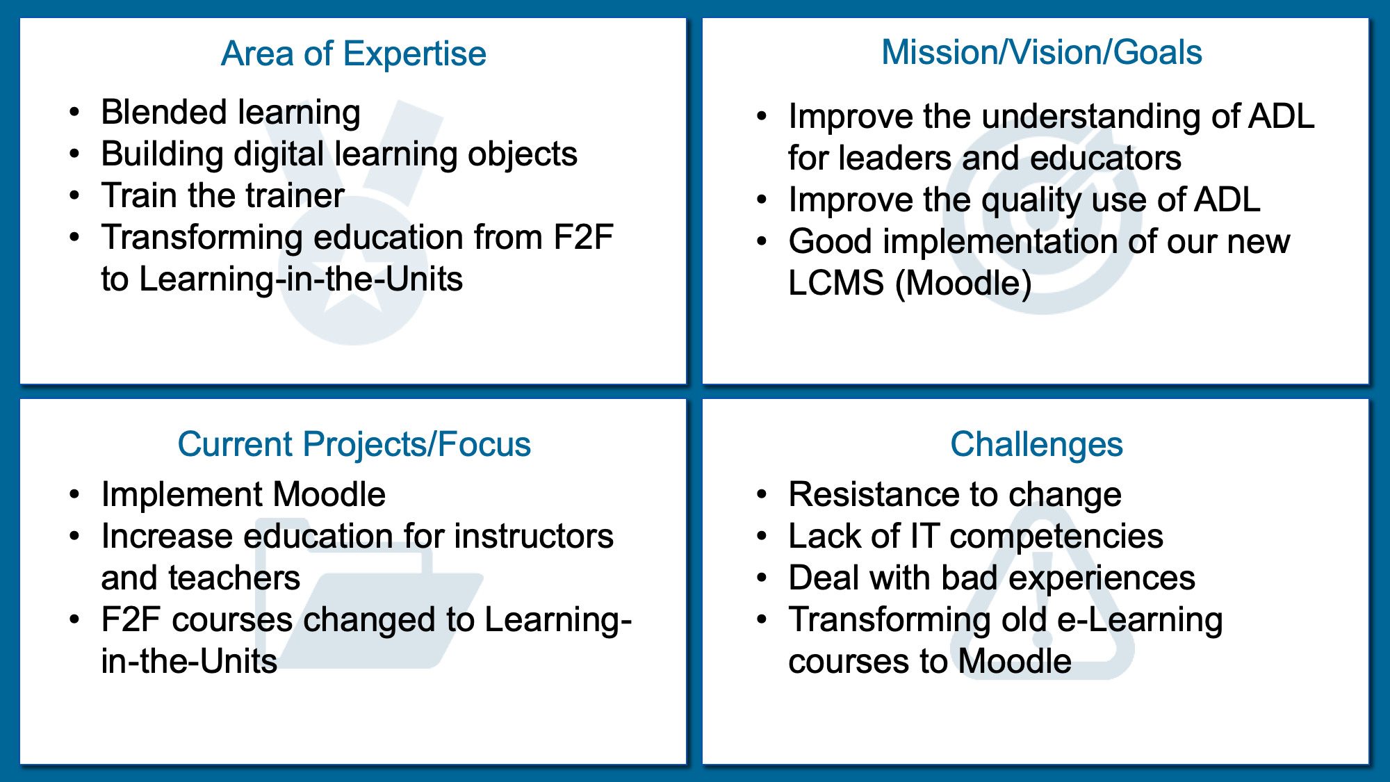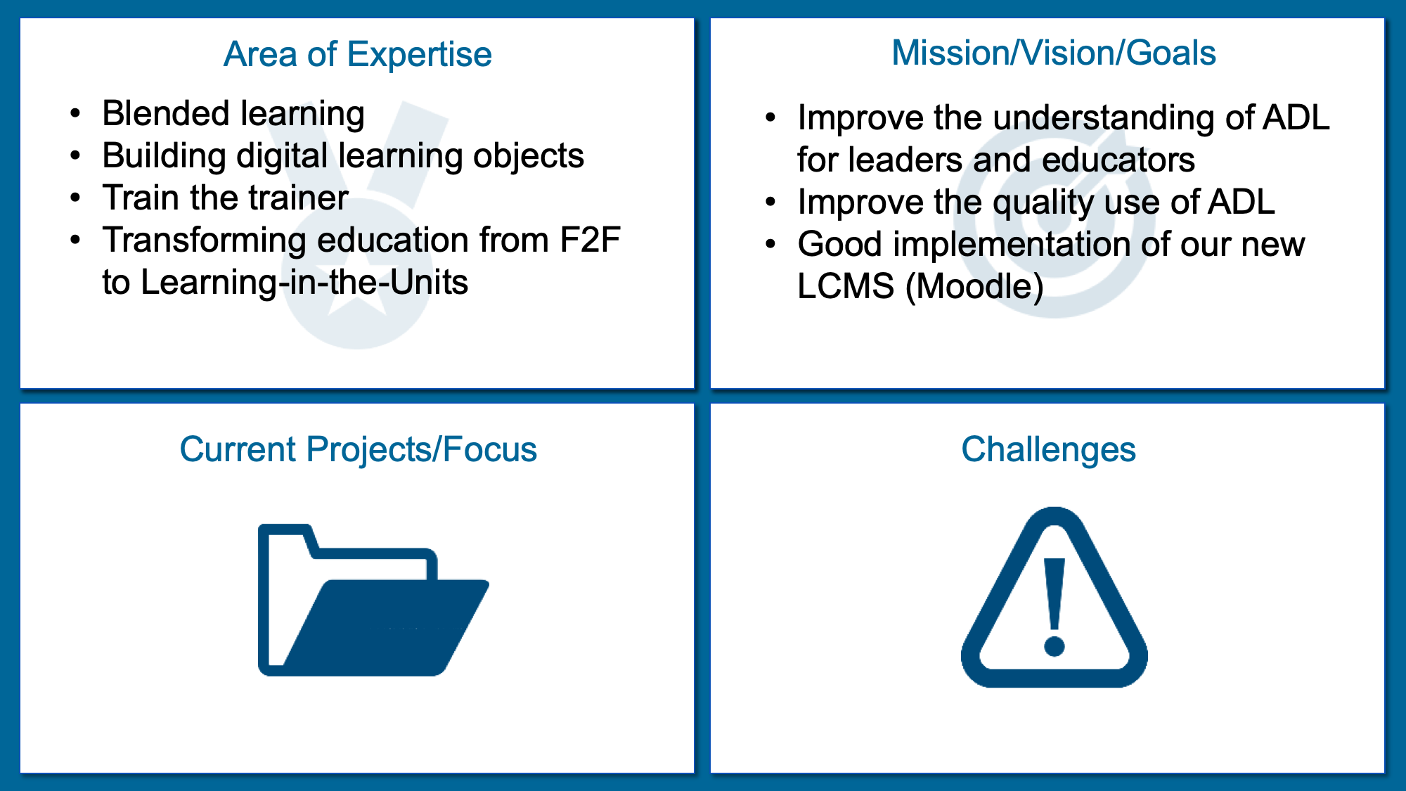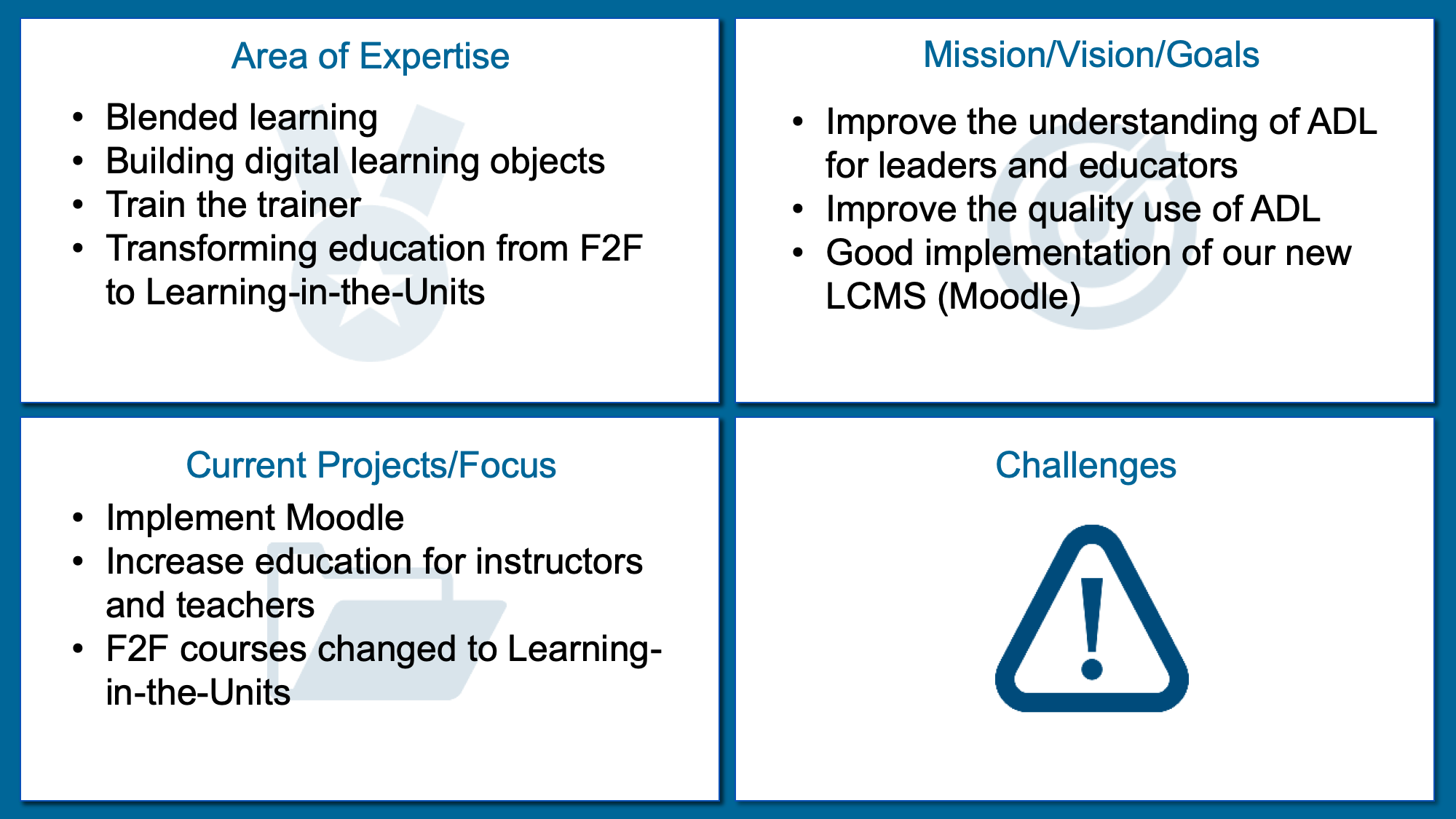 The Danish Center for Education is responsible for the development, procurement, implementation, and evaluation of Advanced Digital Learning (ADL) digital learning resources in the Danish Defence Forces. The main areas include: