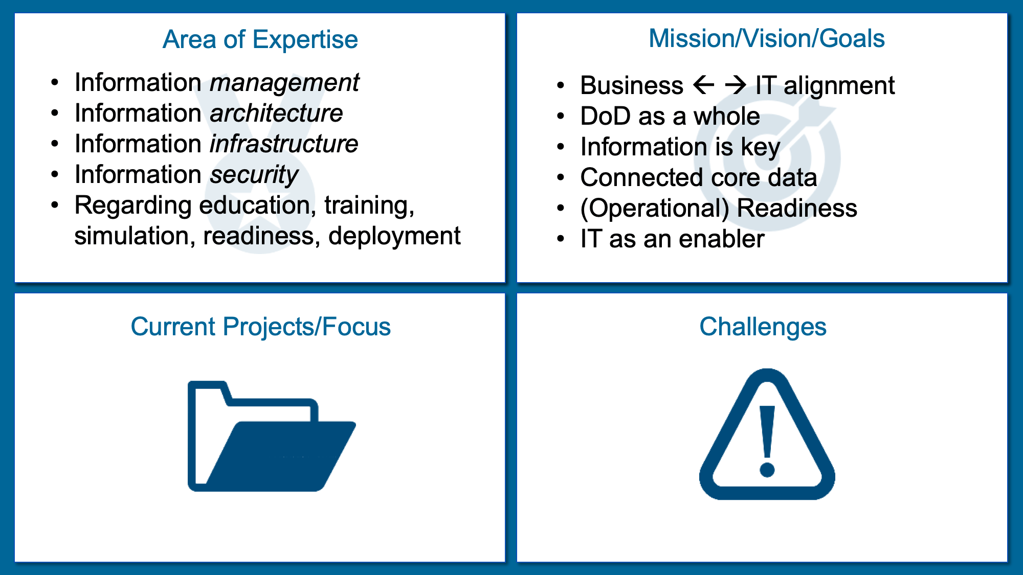 Armand Vincentie started his career in the late 80’s at the Dutch Department of Defense (DDoD) after he graduated as a school teacher. Since there were very few jobs for teachers at that time and the DDoD needed IT specialists, Armand started his internship at DDoD, combining IT studies and past work as a software developer, project manager, and consultant. As a teacher by trade, he stayed in the Education & Training area and did a variety of E&T jobs for the Navy, Land, Air, and Military Police as well as other Dutch Departments such as Internal Affairs and Education. During the late 90’s he earned his degree in Management, Information and Technology. Next, he started several mentoring and coaching tracks on his own, culminating in having mentoring and coaching as an embedded HR instrument in DDoD management. Armand is currently working on management reports for operational readiness: How should they look like and what data should they present?