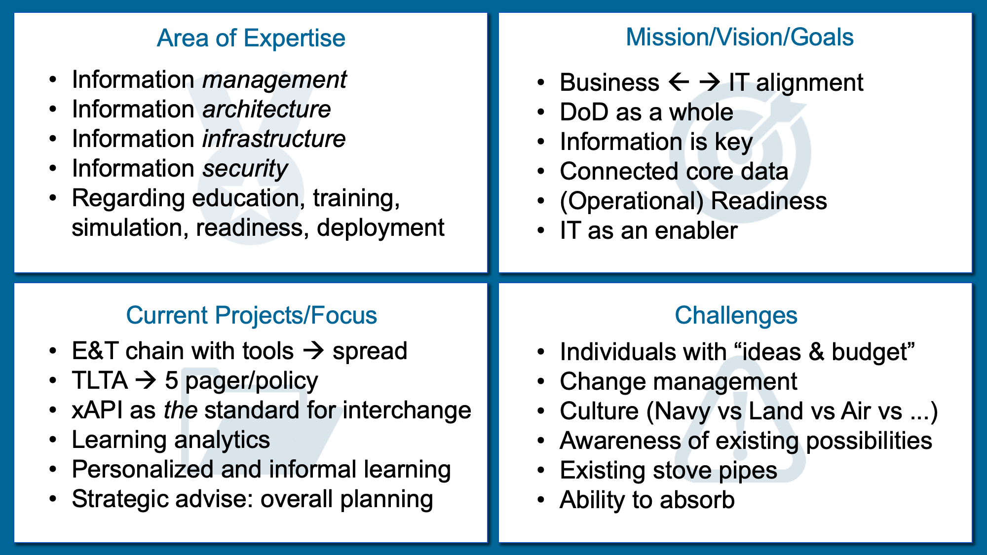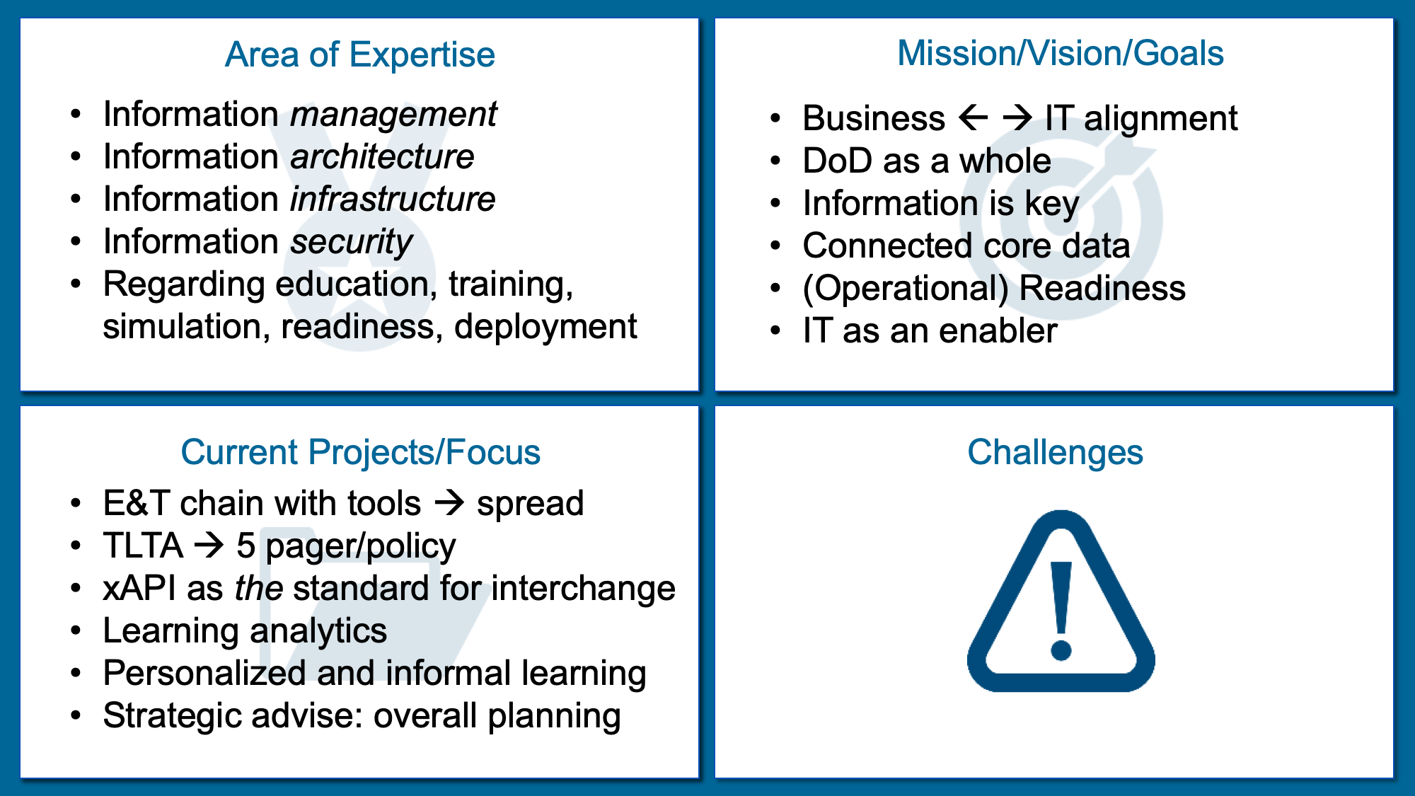 Both Armand and Frank worked-on behalf of the Director of Operational Readiness-since 2008 together with a small team of professionals to take some serious action in standardizing IT for the DDoD schools. The results of five years of work have produced one chain of new IT tools to support all school business functions in a standardized way, thus securing registration of personnel operational readiness data in one centralized database. It is still evolving and growing and harnessing the essential and necessary base of operational readiness. They are now in close contact with the experts in the technical and simulation industry. These costly machines are a means to learn and gain experience and therefore should be connected within the new E&T architecture. Their job in this field is to extract student data for all those different environments (eco-systems, etc.) in a standardized way using xAPI and growing towards the TLA. In a separate track, on behalf of the Director of Operational Readiness, they are working on a completely new way of seeing the primary process of DDoD: instead of seeing readiness as a pre-requisite for combat, these processes are more intertwined, and IT should support both for a smooth transition.