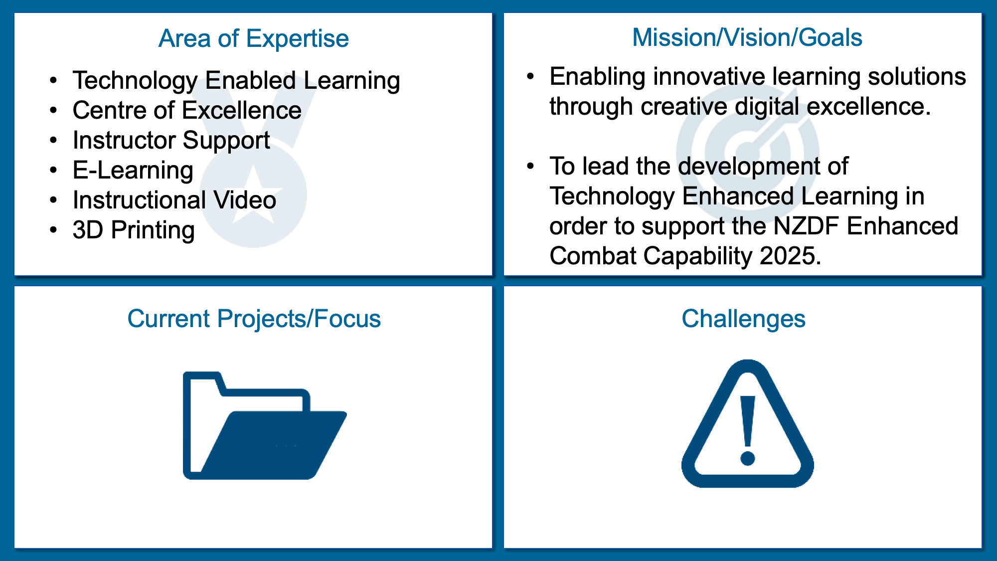 The NZDF ADL Partnership Center is tasked with testing, evaluating, and creating e-learning content for the NZDF. The Lab works with NZDF Training Providers in order to develop innovative ways of incorporating new technologies into training.