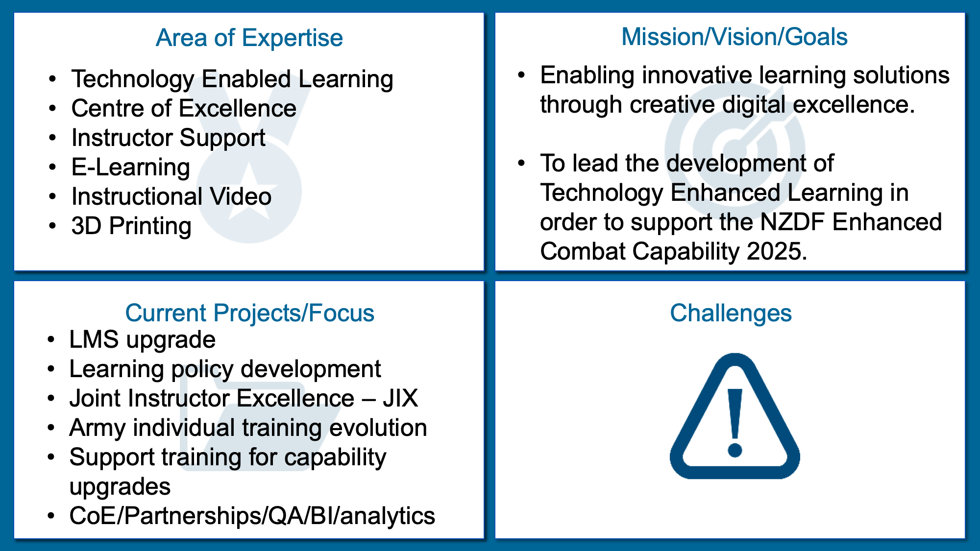 Mr. Boult leads innovation and development of online learning solutions for NZDF. He has spent 25 years as a lecturer/teacher in tertiary and secondary education, specializing in 3D design and sustainable design.