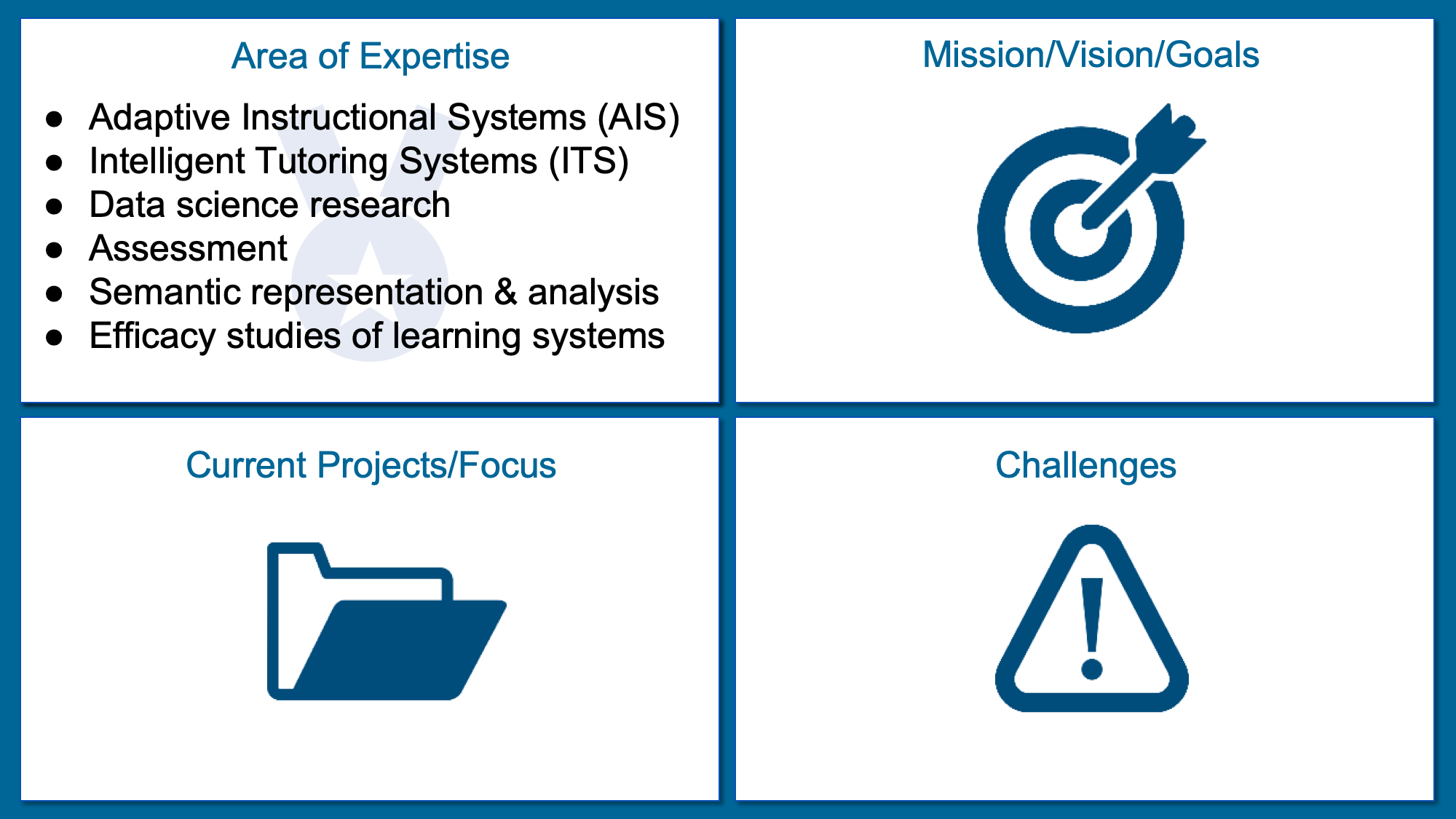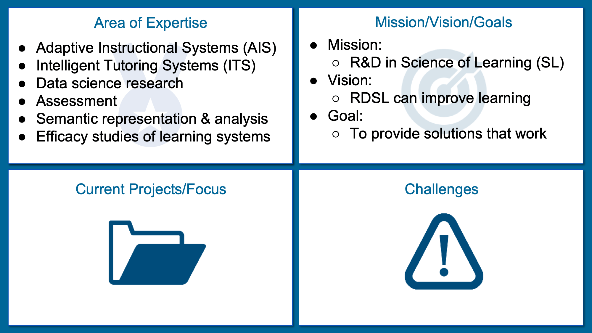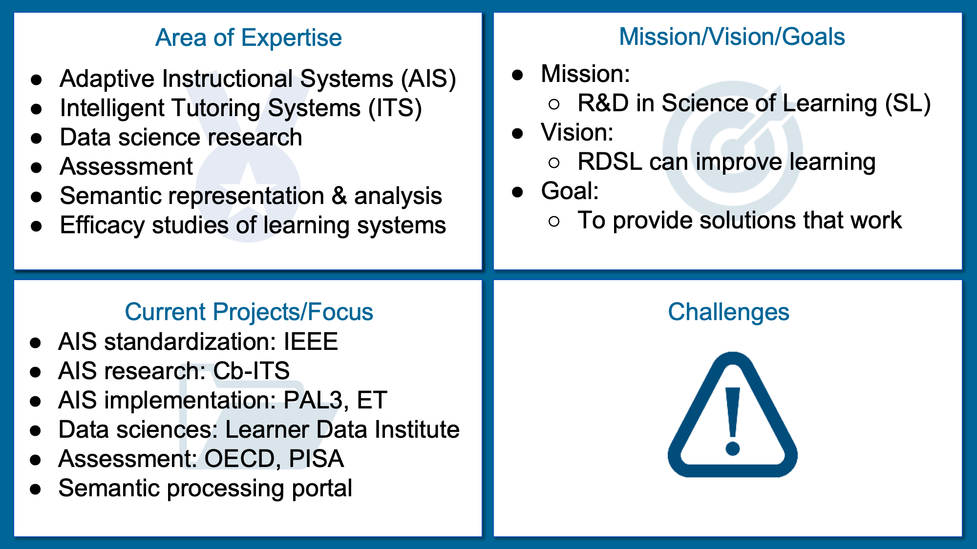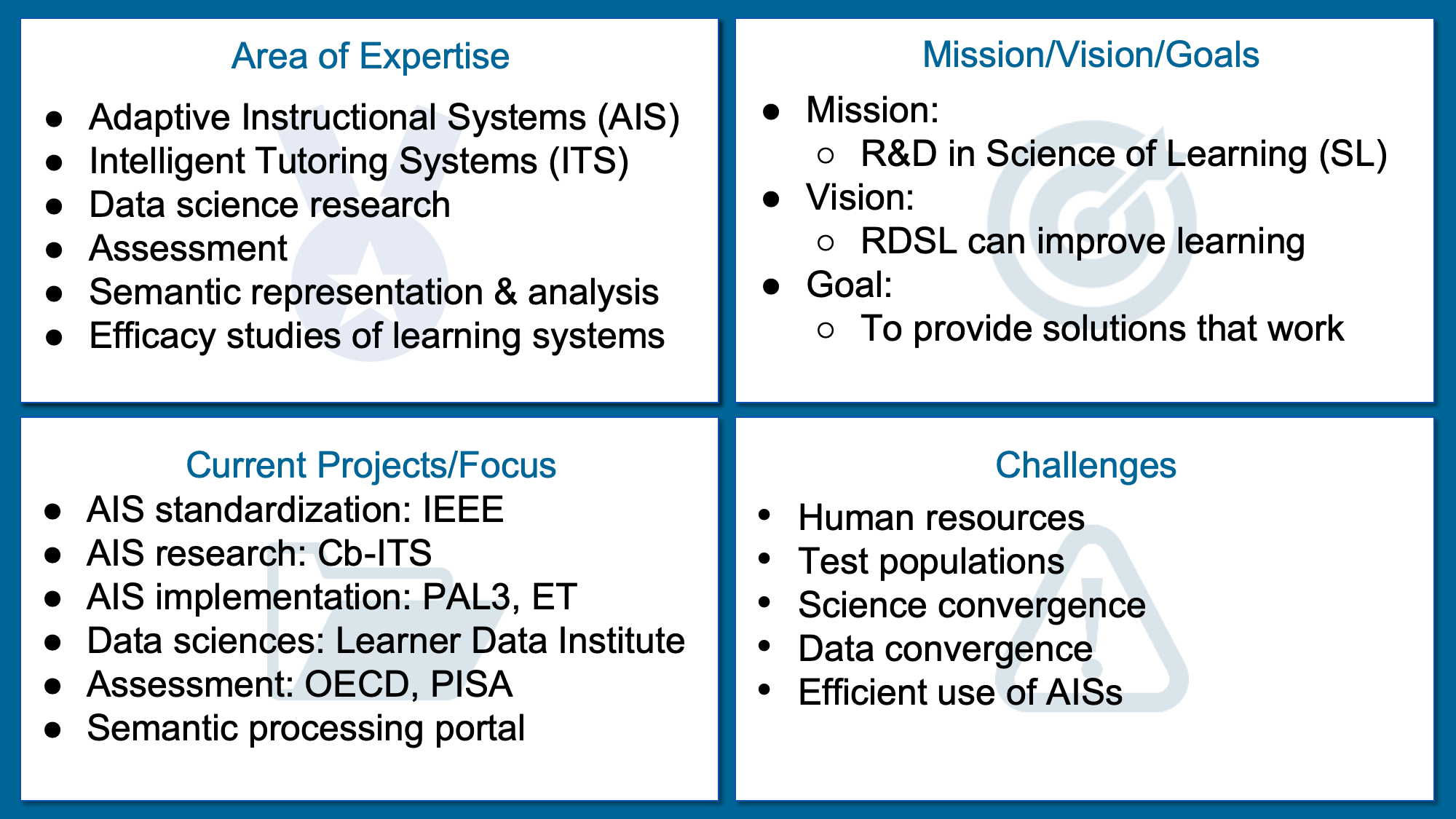 The lab facilitates the research required to address current and future training challenges faced by the military, government, academia, and civilian workforce through the applied use of learning technologies, such as natural dialogue systems and intelligent tutoring systems.