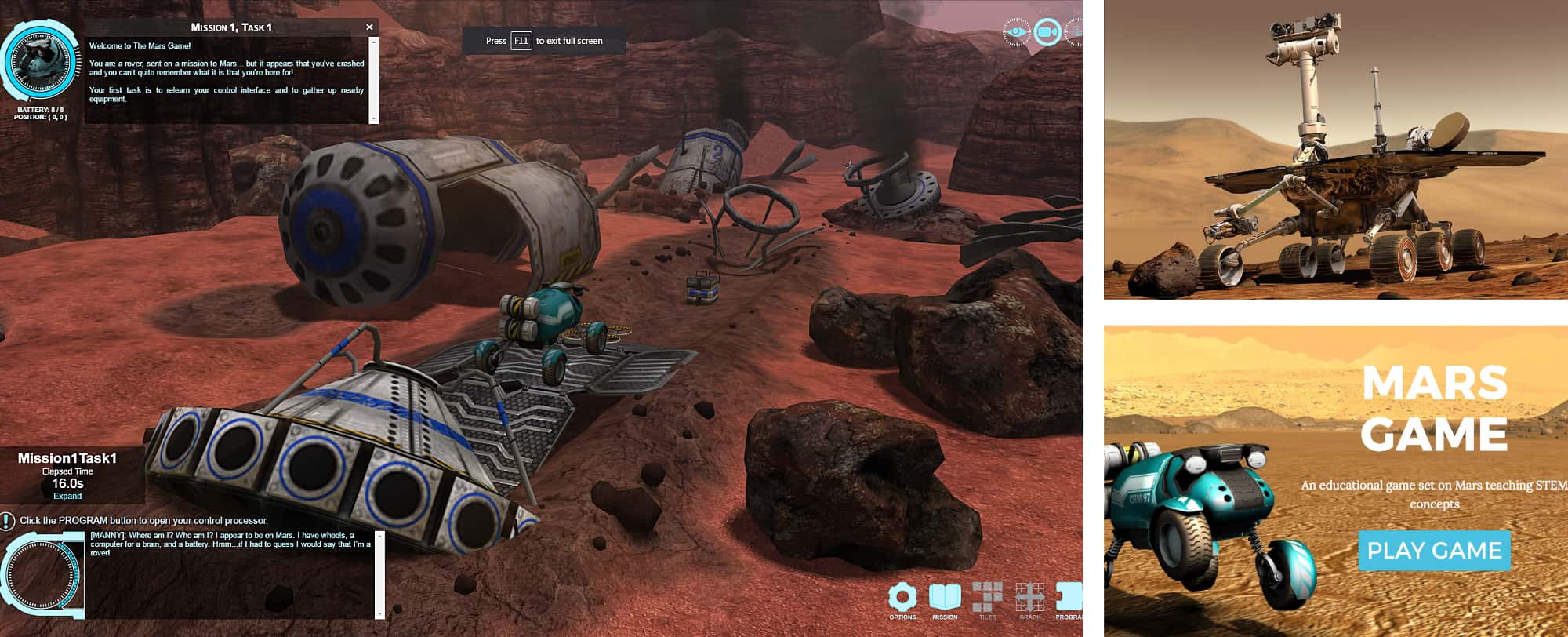Three photo panels: In-game screen capture of rover's first mission, the real-life Opportunity Rover on Mars, and a screen capture of the Mars Game starting screen
