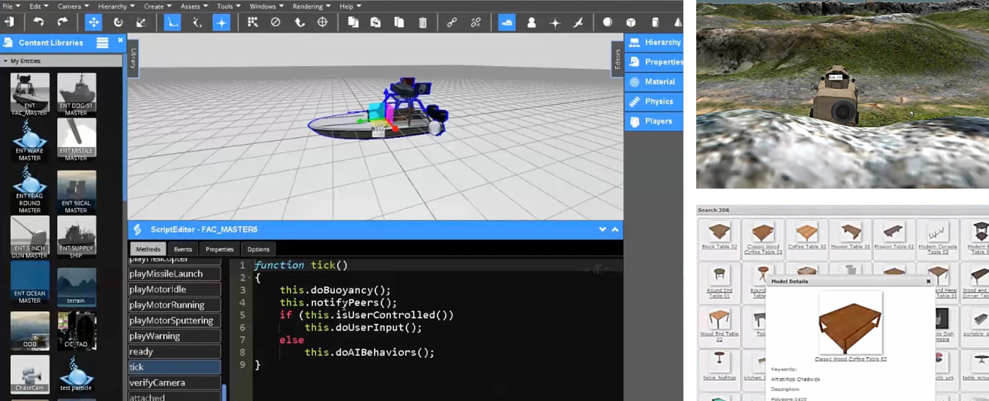 Three application screenshots: Building a 3D scene with a vessel, driving a military vehicle over rough terrain, and choosing a table from the 3D object inventory