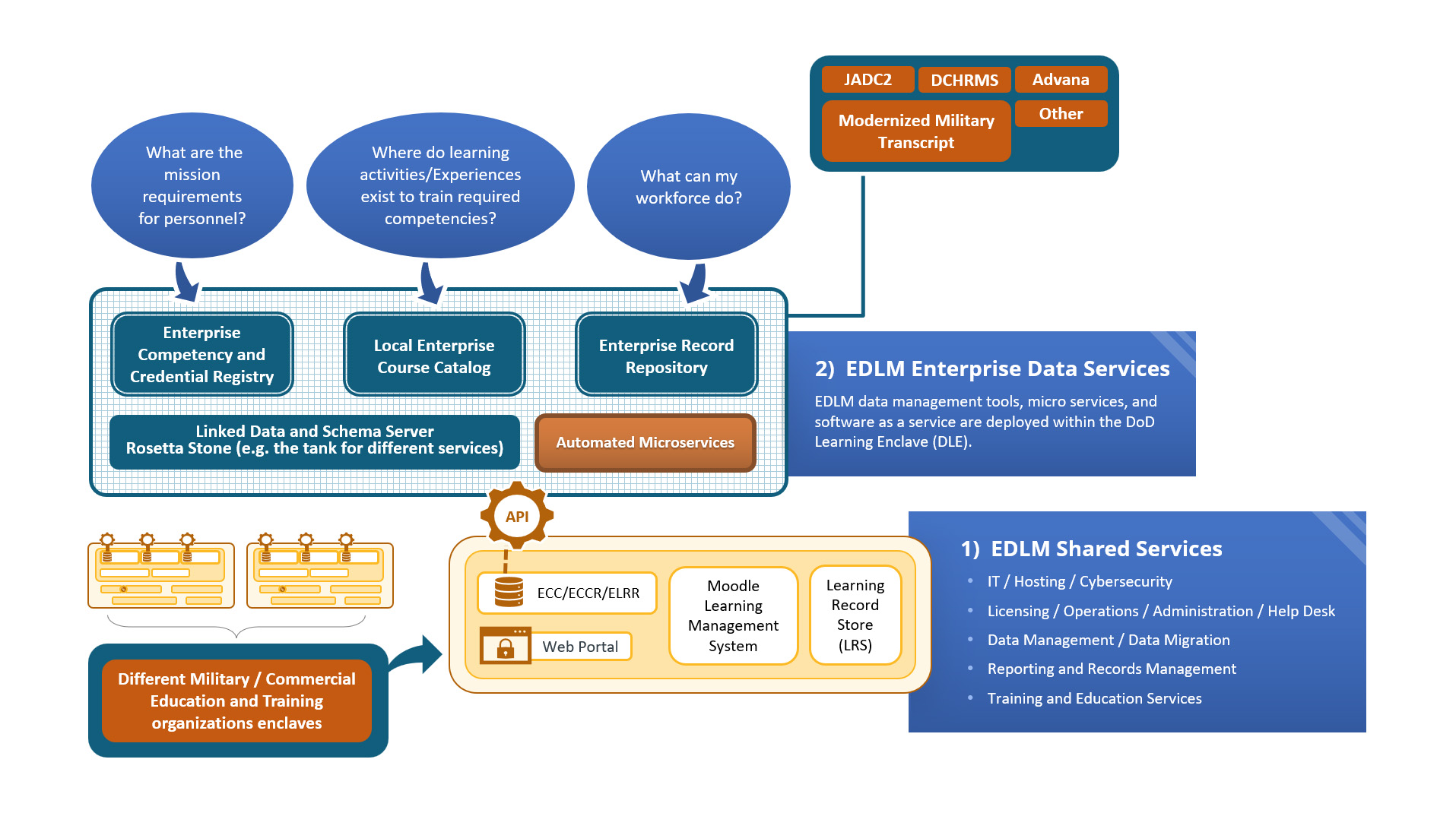 Also in 2020, ADL spearheaded two projects, an Enterprise Course Catalog and an Enterprise Learner Record Repository, in support of the EDLM Learning Systems Modernization line of effort. These systems aggregate learning activity data and personnel performance data, respectively. Stakeholders from all major DoD Components are participating in the EDLM development process. Early adopters include Defense Acquisition University and Air Education and Training Command, which are supporting prototype testing.