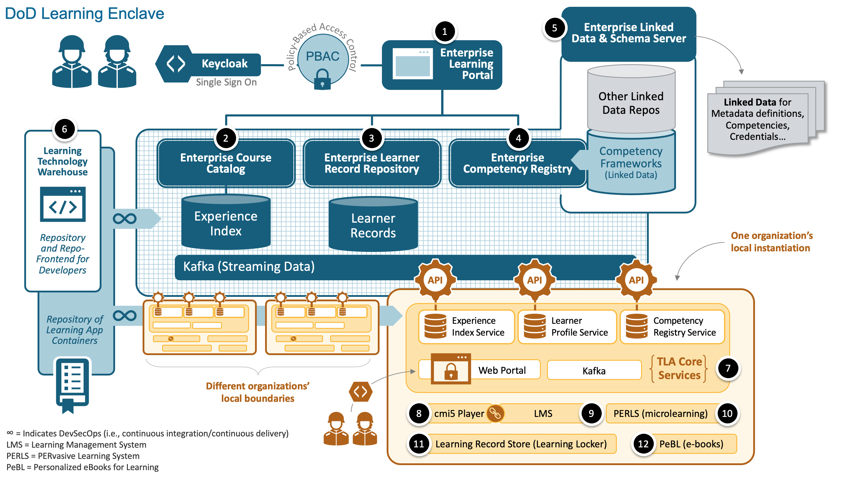 The DoD Learning Enclave is the cloud-based hub that provides the shared software services required to implement a given instantiation of the TLA. In other words, the DoD Learning Enclave hosts the centralized software services that make an enterprise-level TLA-based learning environment function in practice. The DoD Learning Enclave isn’t intended as “the” singular software solution. The intent is not to consolidate all DoD software applications into a monolithic solution, nor does this work attempt to dictate, from the top down, what applications each organization uses. Rather, the DoD Learning Enclave includes (a) data management infrastructure and microservices to share and interpret learner data that are collected from connected systems and (b) some user-facing technologies (such as a learning management system) to demonstrate the proof of concept and provide optional managed software services to interested DoD organizations.